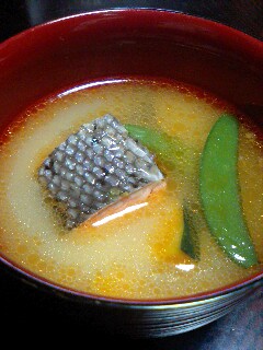 の味噌汁を作ってみた。 南瓜、長ネギ、豌豆も入れて白味噌仕立て。 隠し味に摺り胡麻を少々。 「鮭入りけんちん汁」と言った感じ!? 豆ご飯と一緒に頂きます。 追記・鮭や味噌の塩気が強い場合は豆乳を少し入れるとマイルドになります。 初めまして